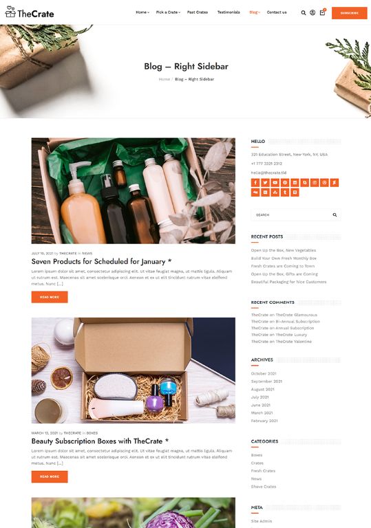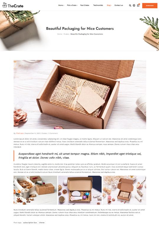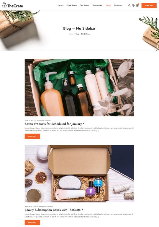 The Perfect Subscription Box ThemeNew Subscription Box Demos Added Weekly Fast & Easy to Use, Extensive Documentation Perfect for Subscription Box Model SitesView DemosPurchase ThemeSubscription Box Premade DemosDifferent Subscription Box Model Premade SitesShave CratesBeauty CratesFresh Food CratesCoffee CratesMeal Kits CratesSubscription Box Inner PagesAll You Need To Start A Subscription Box Model ShopShopSubscription ProductBlog - Left SidebarBlog - No SidebarBlog - Right SidebarBlog ArticleStart Using TheCrate Today!Creating a subscription box shop has never been this easy PURCHASE